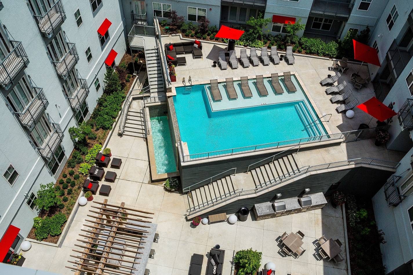 Four to eight story garage wrap with two level courtyard featuring infinity pool. Street level retail complements the already vibrant pedestrian space.
