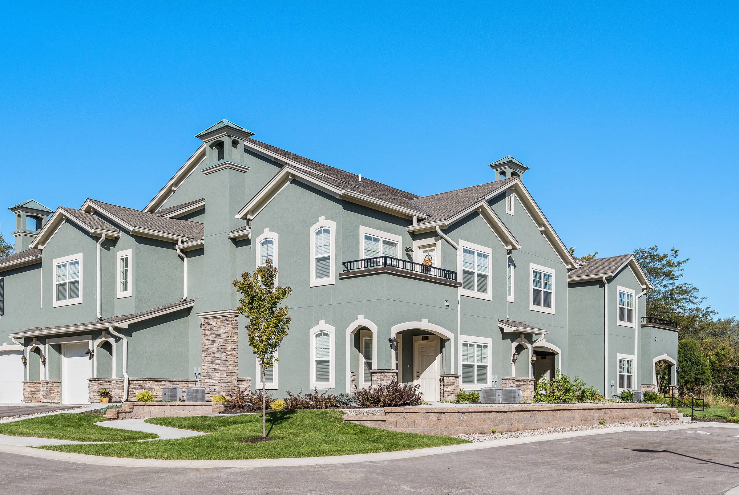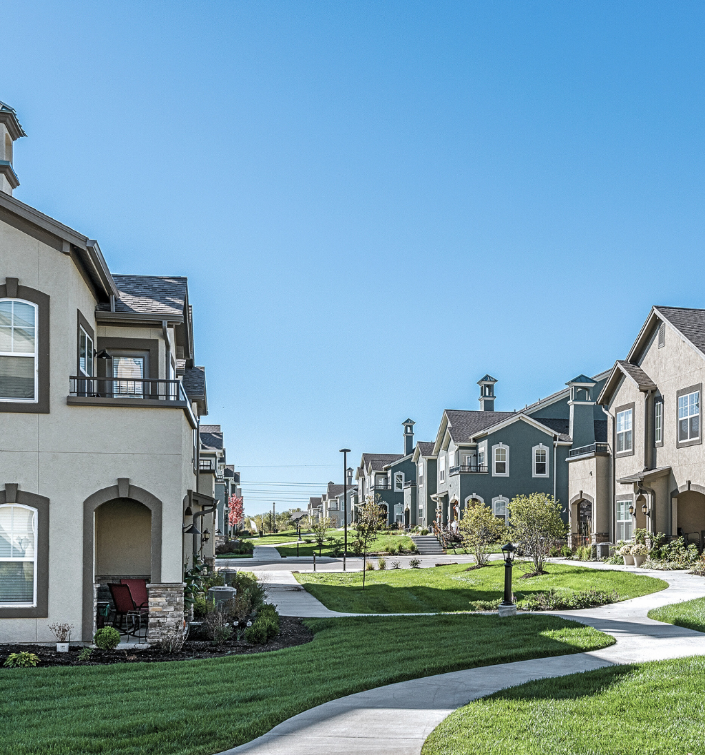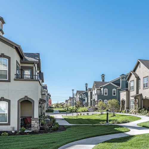 The Landing at Savannah West is a sophisticated apartment community conveniently located in the center of Kansas City’s Northland. Georgian architecture graces 26 buildings in a gated community of 30 acres. Two story 7 and 9 unit buildings on a pedestrian friendly TND grid layout, all with tuck under garages.