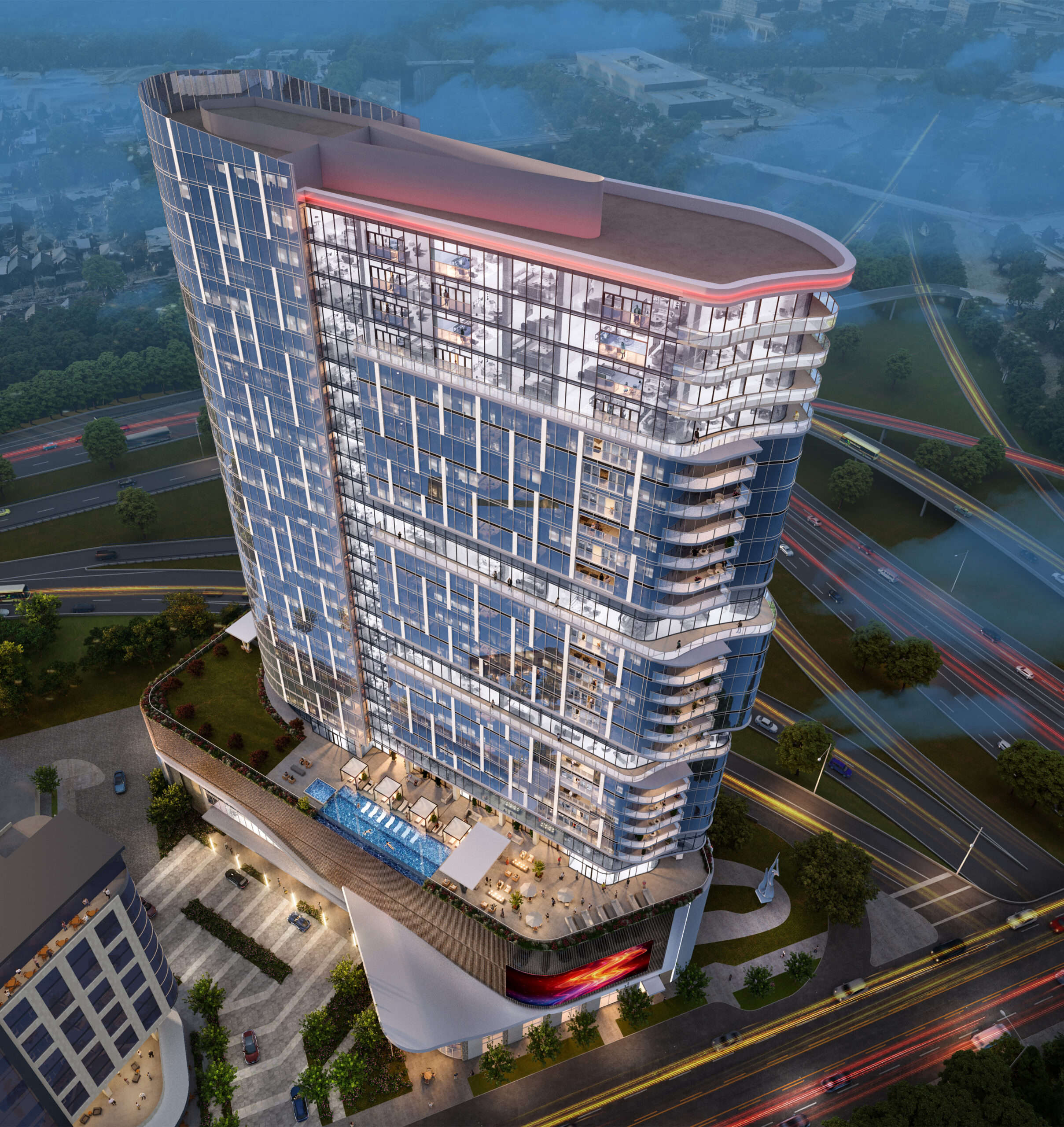 134 studios, 118 one-bedroom, 134 two-bedroom, 6 three-bedroom units, penthouses on upper floors, 10,257 SF street-level commercial space, rooftop amenity deck with pool, 481-stall parking garage.